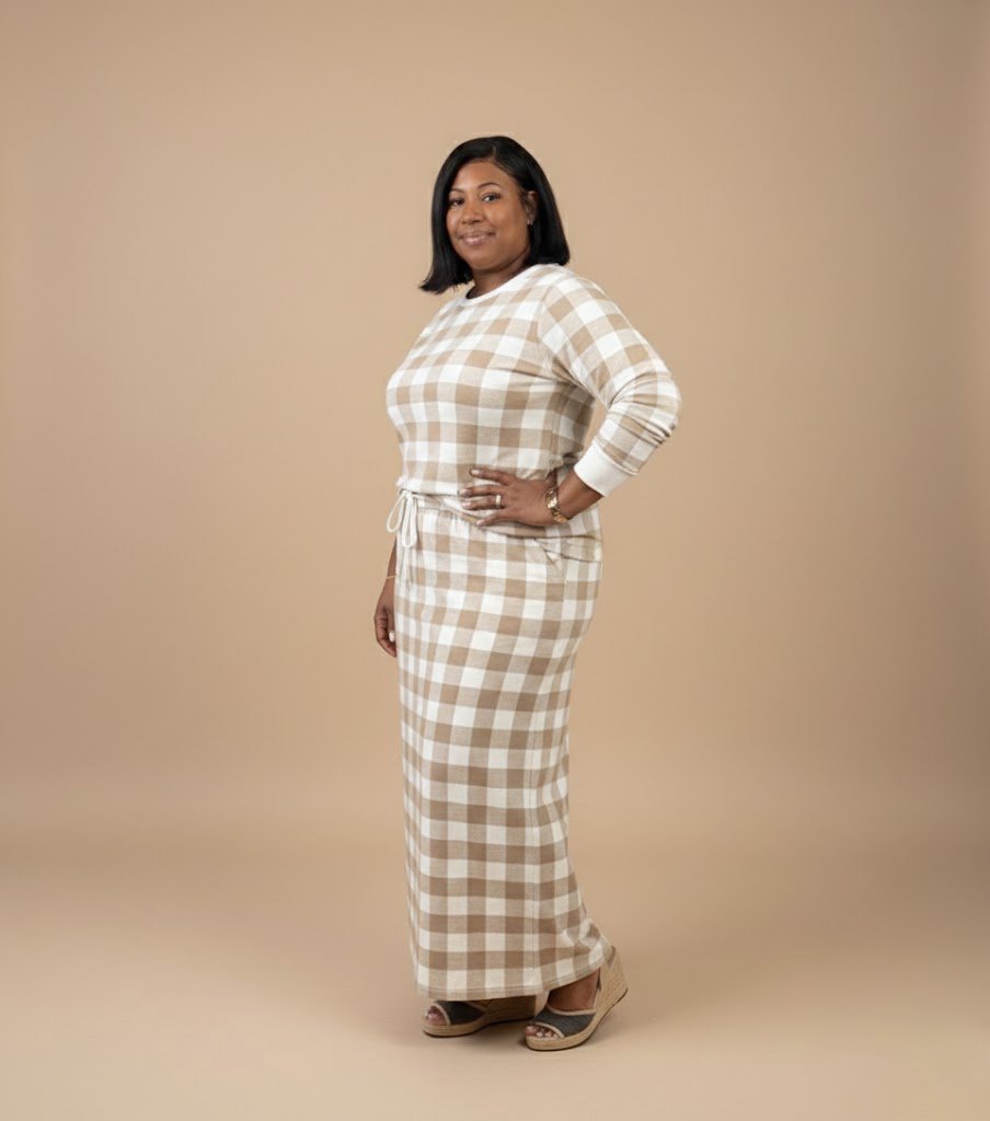 This two-piece set features a long-sleeve plaid top paired with a flowing, skirt-style bottom, offering the comfort of pajamas with the coverage Churchy Chicks love. The neutral plaid pattern creates a calm, timeless look that feels equally at home during morning devotion, relaxed evenings, or slow, intentional weekends.
